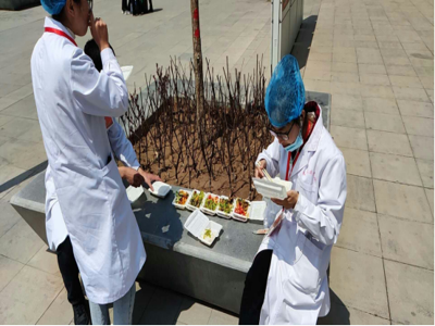 食堂,拥有公司配备的餐牌方可入内,按照规定时间进入餐厅就餐。这时,志愿者们又出现了,对进入人员进行必要的手部消毒,控制员工们在窗口打饭间隔距离。从第一个人进入食堂开始,到最后一个人离开,志愿者们丝毫不敢懈怠。到最后,剩下的食物,便是他们的一日三餐。他们说:“岂能尽如人意,但求无愧于心。