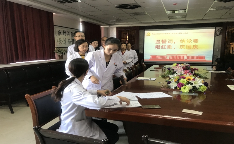 面对鲜红的党旗,中医教工党支部书记张广梅同志带领大家重温了入党誓词。铿锵恢弘的誓词,震撼着在场的每一位党员,使党员们坚定了不忘初心跟党走的理想信念。之后,两个支部的党员按照规定标准缴纳了9月份党费。此项活动增强了党员缴纳党费的积极性和主动性,也使广大党员明确了按时缴纳党费是每一位党员应尽的义务。最后全体党员齐声高唱《没有共产党就没有新中国》、《我和我的祖国》等经典红歌。在场党员心情澎湃,唱出了对党的敬意,激起了铭记历史、牢记艰苦的昨天,珍惜来之不易的今天,奋力开创美好的明天。