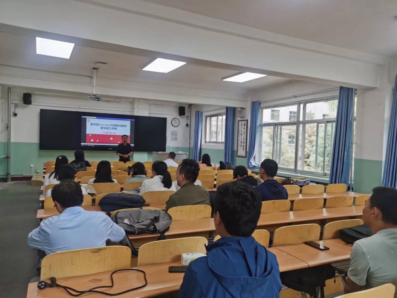 本次考核地点在医学部昆仑路校区东教学楼202、302教室,分为两个小组同时进行,每小组4名专家,13位青年教师参加。教学管理部办公室沈国平主任依次介绍了担任本次考核组的各位专家以及考核的主要内容和注意事项,并鼓励青年教师以此次考核为平台乘风破浪、迎难而上。