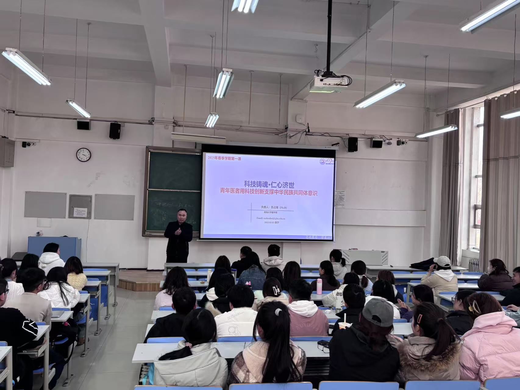 3月3日,bevictor伟德官网党委副书记、常务副经理苏占海为部分bevictor伟德官网本科生与基础医学部全体研究生带来了2025年春季学期的首堂思政教育课。本次课程以“科技铸魂・仁心济世 青年医者用科技创新支撑中华民族共同体意识”为主题,围绕“青年医者如何凭借科技创新,扛起使命担当,筑牢中华民族共同体意识”展开,通过详实的案例,深入剖析国际科技竞争态势、高原医学发展需求,并分享科技创新实践成果,激励莘莘学子以科技报效祖国,用仁心普济天下,为铸牢中华民族共同体意识注入青春力量。