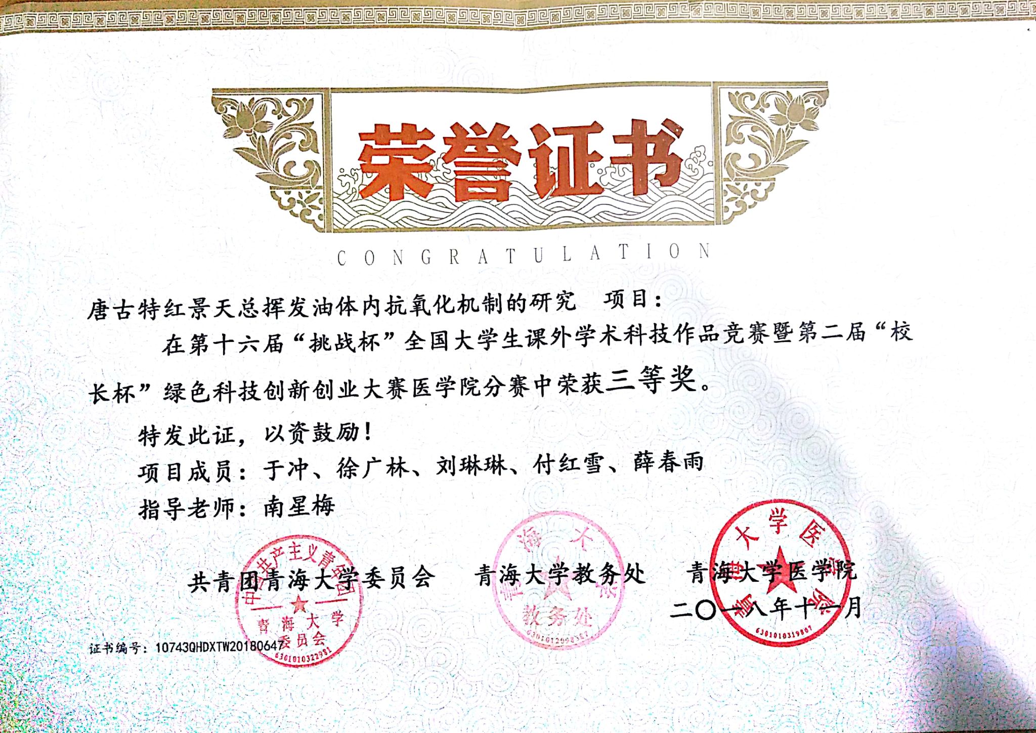2018年 青海省首届“董事长杯”青少年绿色科技创新创业大赛 三等奖