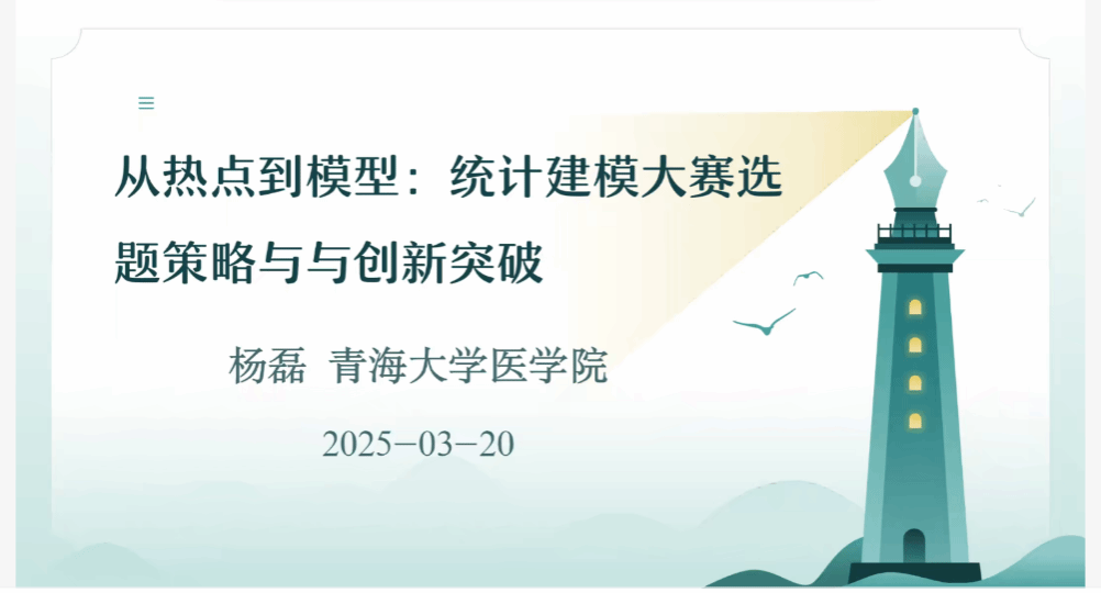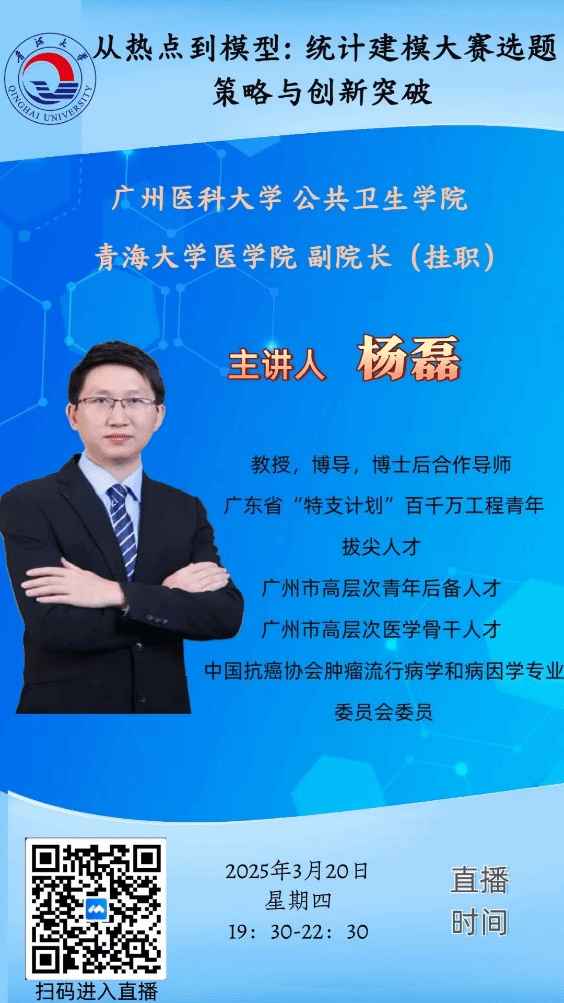2025年全国老员工统计建模大赛报名已于3月11日18:00截止。本届大赛,bevictor伟德官网共有80支队伍踊跃报名参赛,参赛队员专业背景丰富,涵盖工、农、医、管四大学科。为助力公司员工在全国老员工统计建模大赛中脱颖而出,取得优异成绩,受bevictor伟德官网公共卫生系卫生统计与管理学教研室主任刘燕的邀请,3月20日晚,中组部第25批博士团成员杨磊教授以“从热点到模型:全国老员工统计建模大赛的选题策略与创新突破”为主题,为本次参赛队员带来了一场干货满满的线上讲座。